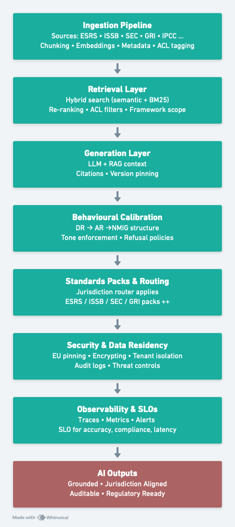 - Policy Packs: YAML/JSON policies per framework (ESRS, ISSB, SEC), defining allowed section headers, tone parameters, refusal templates, and mandatory citation structures.